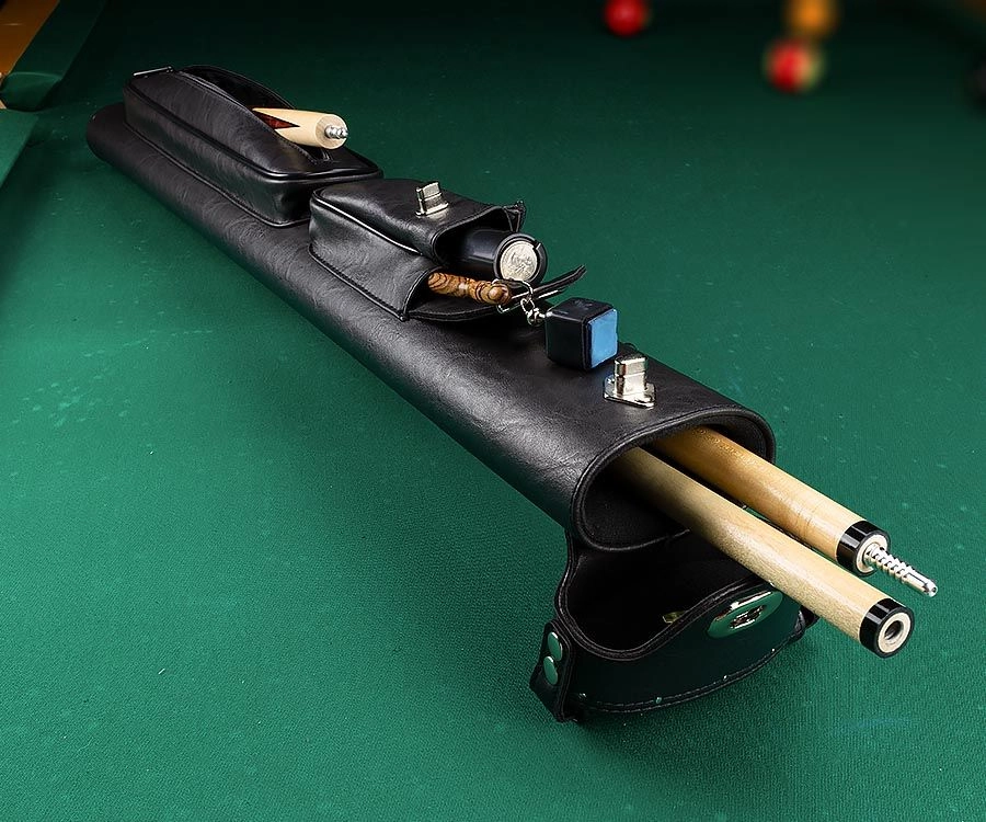 This Instroke Premier pool cue case is perfect if you are looking for a less expensive case built around keeping your cue safe. The separate high impact tubes in the structure of this case are waterproof above the base, and feature foam padding with soft, tricot, moisture resistant lining inside of them. The case is made of black vinyl and has 2 pockets enabling you to carry whatever pool accessories you please. There are plastic feet on the base to reduce wear, two handles, and an adjustable shoulder strap to use if you prefer.